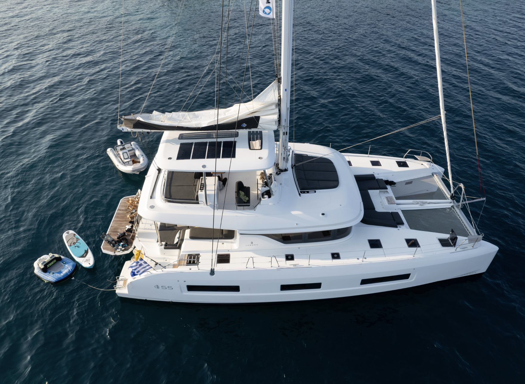 The Lagoon 55 stands among the most prestigious sailing catamarans available for charter in Greece, redefining life on the water with remarkable volume, sophisticated design, and seamless indoor-outdoor living. Created for guests who seek the atmosphere of a private super-villa at sea